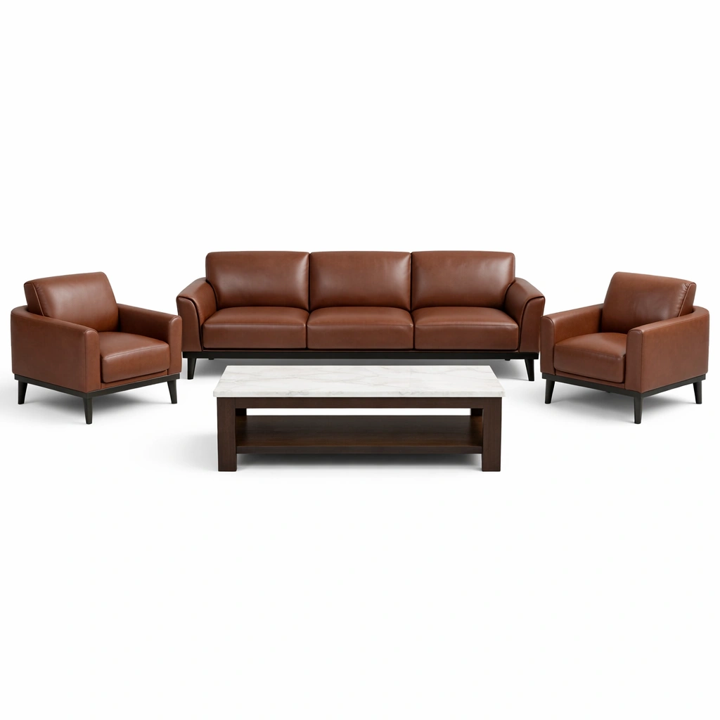 Dieses Set besteht aus einem Dreisitzer-Sofa, zwei Sesseln und einem Couchtisch. Das Sofa und die Sessel sind mit PU-Leder bezogen und mit hochdichtem Schaumstoff gefüllt. Der Rahmen besteht aus Massivholz.