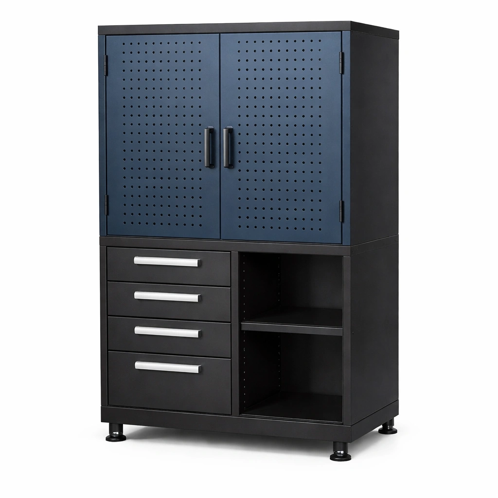 Er verfügt über 2 perforierte Türen, 3 Schubladen und 2 offene Regale. Zudem sind die Standfüße verstellbar. Das Gesamtgewicht beträgt 65 kg.